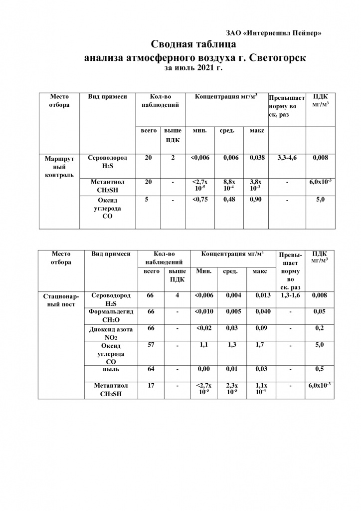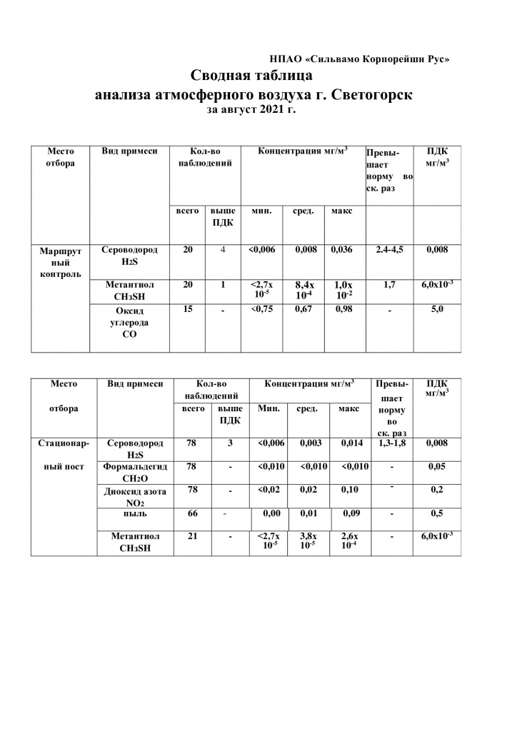 Сводная таблица анализа атмосферного воздуха г. Светогорска за 3 квартал 2021 г.