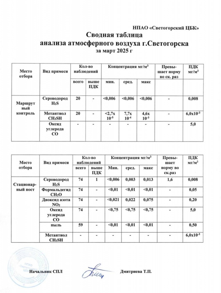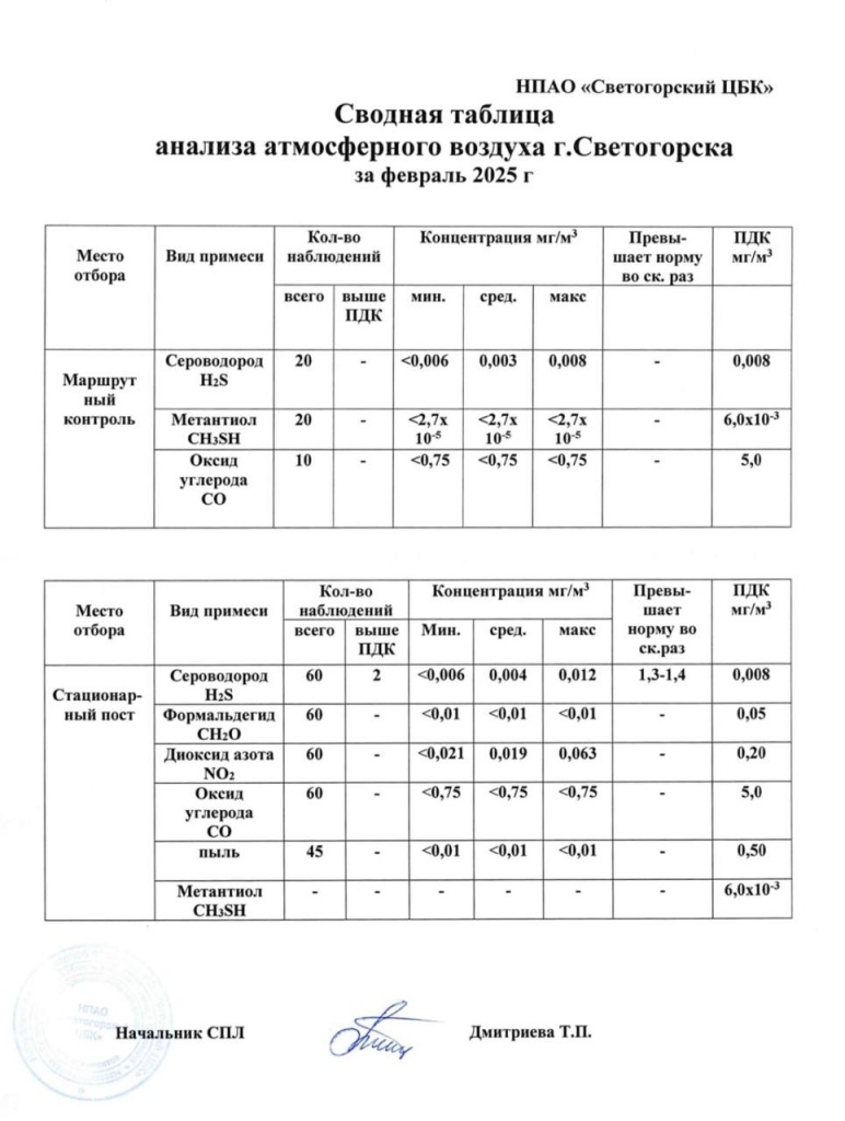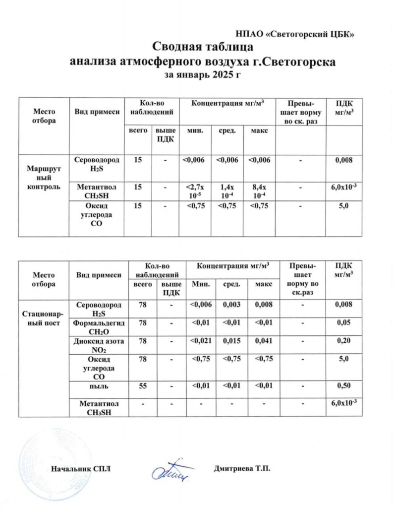 Сводная таблица анализа атмосферного воздуха г. Светогорска за 1 квартал 2025 г.