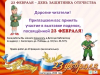 Детский отдел Светогорской городской библиотеки приглашает принять участие в выставке поделок, посвящённых Дню защитника Отечества.