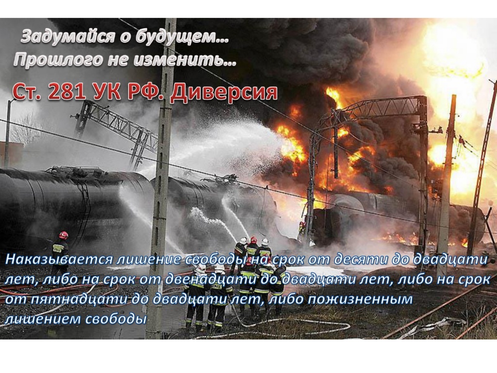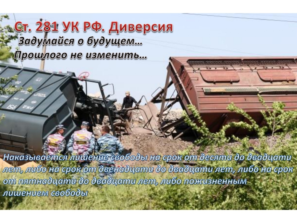 В соответствии с Уголовным кодексом Российской Федерации противоправные действия на объектах железнодорожного транспорта могут рассматриваться правоохранительными органами как подрыв экономической безопасности и (или) обороноспособности Российской Федерации. Все преступления данной категории относятся к категории тяжких и особо тяжких, по которым уголовная ответственность наступает с 14 лет.