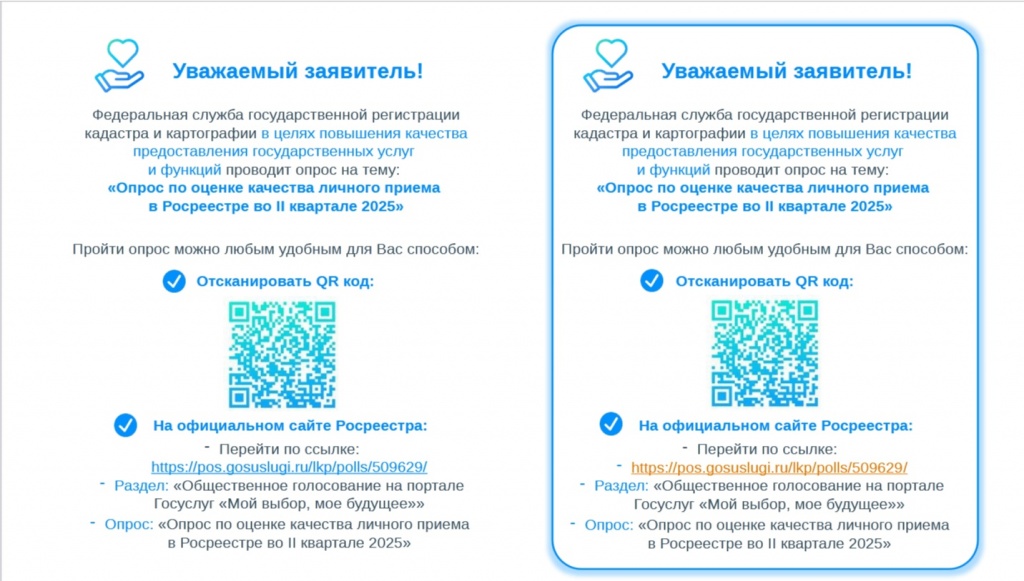 Росреестр приглашает пройти опросы. Росреестром размещены: «Опрос по оценке качества работы с обращениями граждан в Росреестре во II квартале 2025» и «Опрос по оценке качества личного приема в Росреестре во II квартале 2025».