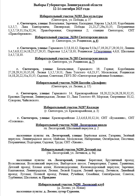 Адреса избирательных участков, находящихся на территории Светогорского городского поселения