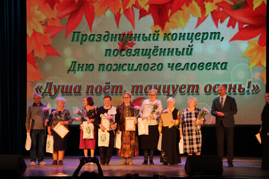 1 октября в ДК г. Светогорска прошел праздничный концерт «Душа поет, танцует осень», посвящённый Дню пожилого человека. В этот вечер на сцене чествовали людей золотого поколения, как принято называть возраст мудрости и опыта за их труд, ценности и традиции, которые они передают молодому поколению, их заботу и особую душевность. Всех собравшихся поздравил глава администрации Светогорского городского поселения Евгений Валерьевич Шестаков. Подарками, цветами и благодарственными письмами администрации за активную жизненную позицию, патриотическое воспитание молодежи, большой личный вклад в развитие ветеранского движения на территории Светогорского городского поселения были отмечены активисты Советов ветеранов, которых на территории поселения четыре, а именно: Шмиголь Наталья Борисовна и Николай Яковлевич, Тимофеева Зоя Тимофеевна, Долженко Ольга Васильевна, Лебедева Вера Семеновна, Блинова Нина Александровна, Лебедева Нина Разумовна и Минеева Валентина Владимировна. Концертная программа была представлена выступлениями взрослых и детских коллективов и исполнителей ДК г. Светогорска и юных артистов Детско-юношеского центра творчества.